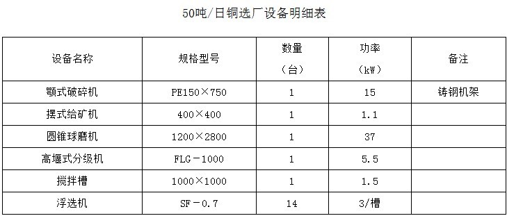 今日我們?yōu)楹颖庇脩?hù)配置了一套輔助選銅礦生產(chǎn)線,是為了因?yàn)樵撱~礦廠除了主要銅礦石外,還有氧化鋅銅礦石需要通過(guò)選銅處理,所以我廠在為用戶(hù)另外配置了一條日產(chǎn)50噸的選銅生產(chǎn)線,主要銅礦選礦設(shè)備有PE150*750鄂式破碎機(jī)、400*400擺式給礦機(jī)、1200*2800圓錐球磨機(jī)、PLG高堰式粉機(jī)、攪拌槽和浮選機(jī),具體型號(hào)參數(shù)如下圖: